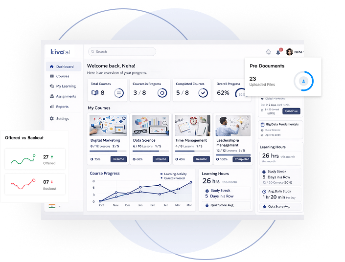 Traditional LMS platforms store content. An AI agent powered LMS actually thinks, decides, and acts. Kivo’s AI agent based LMS works like a dedicated learning manager— assigning courses, tracking progress, nudging learners, answering questions, and continuously improving outcomes without manual effort. Built for fast-growing teams that want learning to scale without friction.