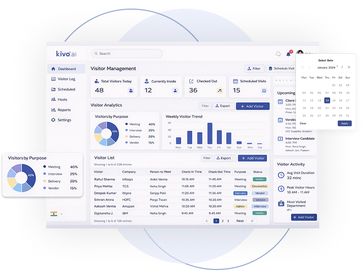 Know exactly who is inside your premises at any moment. Track visitor status, purpose of visit, and location in real time — all from one dashboard. Perfect for security, audits, and emergency readiness.
